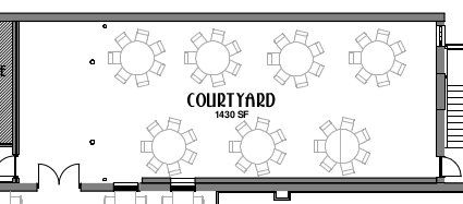 The Courtyard has overhanging trees and period lighting to accent its comfortable atmosphere. At its north end, two heavy iron columns hold up a cabana roof, framing a space for buffet food service, a wet bar, a music group, or something else you might dream up.